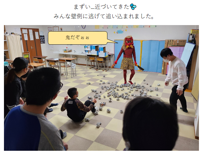 今年は段ボールで作った鬼を、新聞豆で退治するゲームからスタート。